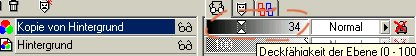 Auswahl/keine Auswahl. Suche Dir nun mit der Farbpipette eine Farbe aus Deinem Bild raus und setze sie als Hintergrundfarbe. Gehe nun wieder auf Bild/Rahmen hinzufügen und stelle diesmal 15 ein (symetrisch). Markiere diesen Rahmen wieder mit dem Zauberstab und nun dupliziere die Ebene indem Du auf Ebenen/Duplizieren gehst . Nun gehe auf Effekte/Plugin Filter/Kiwi Oelfilter/Setzboard -Fachgrösse 7. Nun klicke auf dieses Zeichen in Deiner Leiste in PSP  . Stelle die Deckfähigkeit der duplizierten Ebene auf 34.